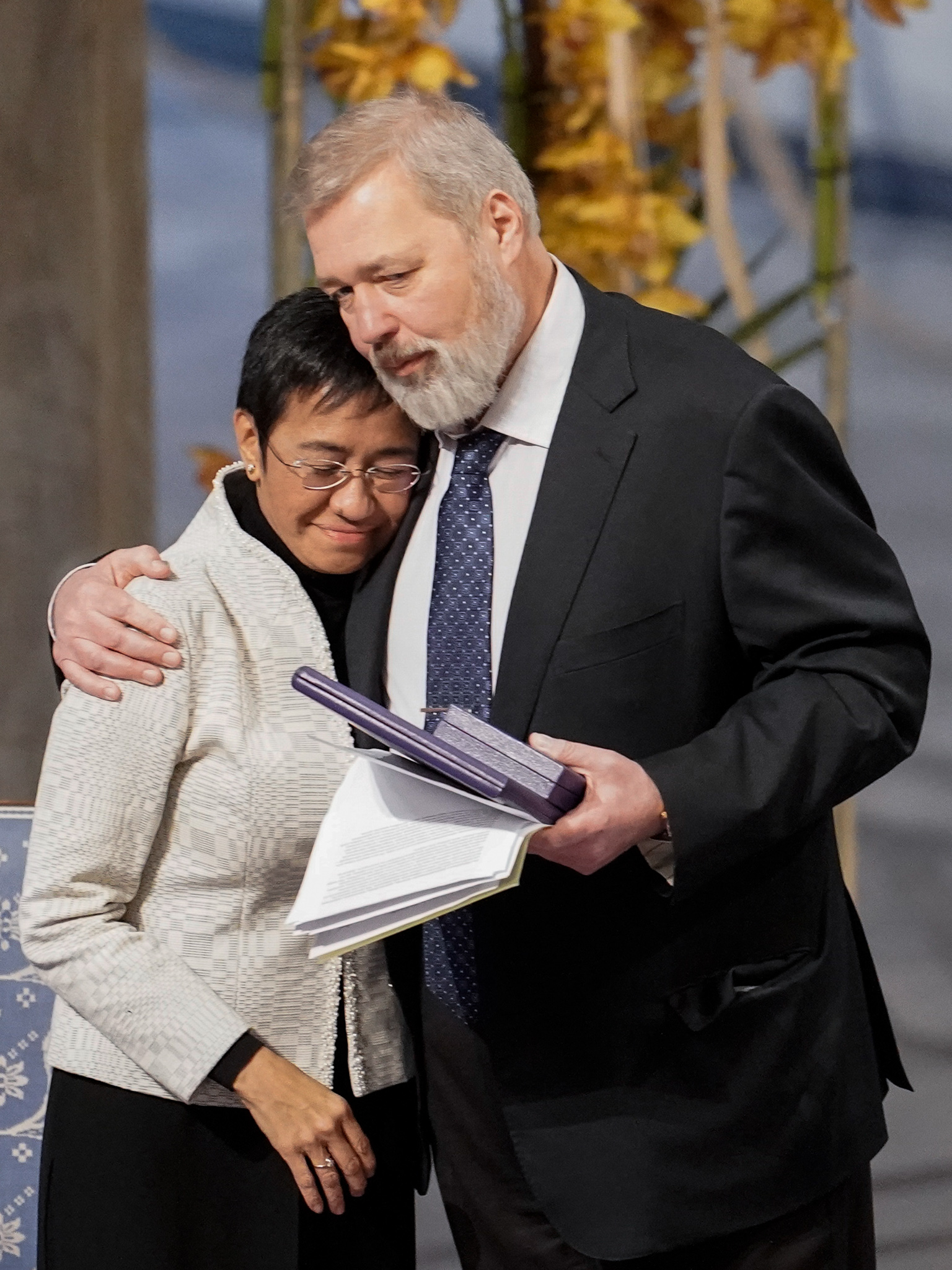 Årets fredsprismottakere holdt to sterke nobelforedrag om ytringsfrihet. Dmitrij Muratov fikk hele salen til å reise seg for å hedre alle reporterkollegaer som har gitt sitt liv for yrket, med ett minutts stillhet. Han avsluttet talen med å si: