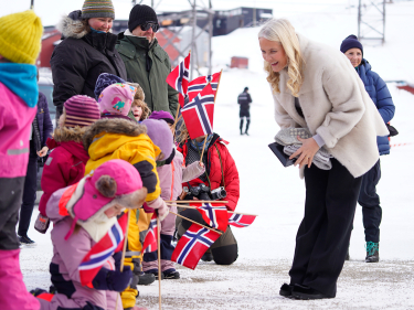 Kronprinsessen hilser på noen av barna som møtte Kronprinsparet utenfor Longyearbyen folkebibliotek. Foto: Ole Berg-Rusten / NTB