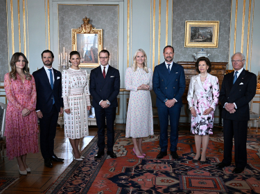 Kong Carl Gustaf, Dronning Silvia, Kronprinsesse Victoria, Prins Daniel, Kronprins Haakon, Kronprinsesse Mette-Marit, Prins Carl Philip og Prinsesse Sofia var alle til stede til lunsj på Stockholm slott. Foto: Pontus Lundahl / TT / NTB