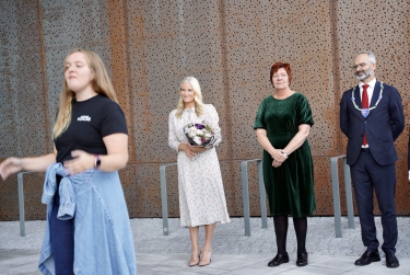 Utenfor biblioteket ble Kronprinsesse Mette-Marit møtt med sang fra barnekoret Skedsmo Young Voices. Biblioteksjef Sølvi Tellefsen ledsaget Kronprinsessen, statsforvalter Valgerd Svarstad Haugland, ordfører Jørgen Vik i Lillestrøm kommune og politimester Ida Melbo Øystese inn i det nye biblioteket.