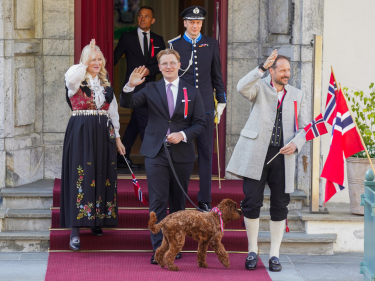 Kronprinsfamilien kommer ut for å hilse barnetoget i Asker. Foto: Lise Åserud / NTB