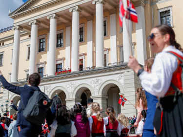 Kongefamilien hilser barnetoget i Oslo fra Slottsbalkongen. Foto: Frederik Ringnes / NTB
