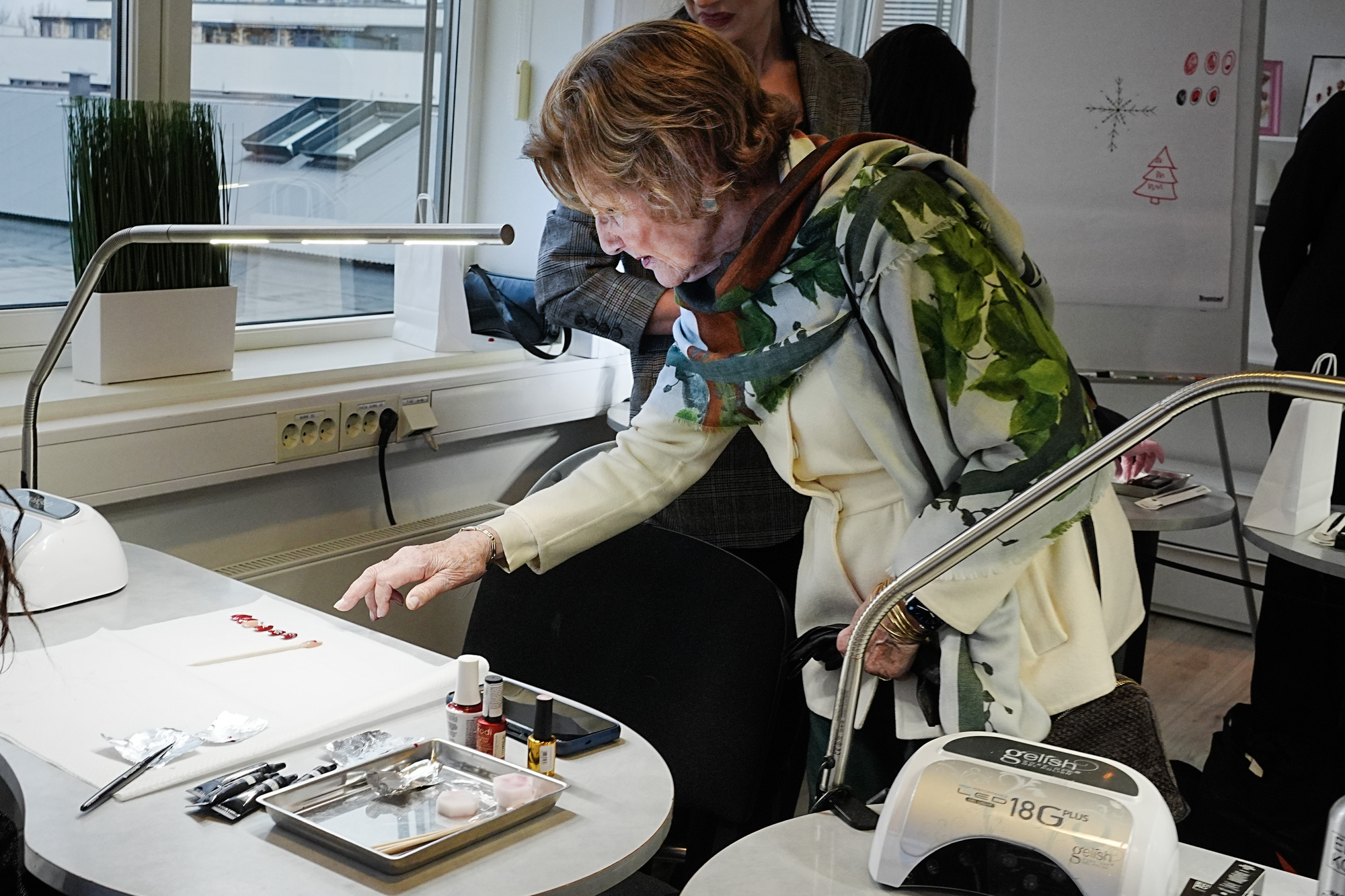 Dronning Sonja fikk selv prøve seg på negledesign sammen med en av studentene. Foto: Terje Pedersen / NTB