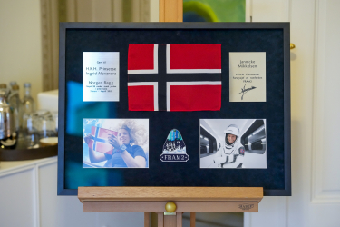 Under audiensen overrakte Mikkelsen et norsk flagg innrammet med bilder fra ferden i verdensommet. Flagget har vært på med en oppskyting, og med på den første polare ferden over Nordpolen og Sydpolen, hele 56 ganger rundt jorden.