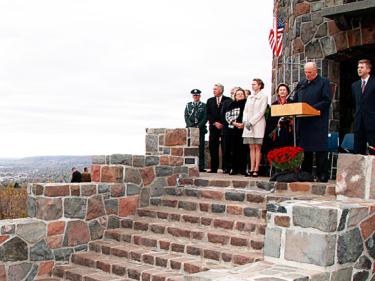 Kor og trommer ledsaget det kongelige følget på spaserturen opp til tårnet. Her kunne de se plaketten ved tårnets fot, der det blant annet står å lese at tårnet opprinnelig ble innviet av Kronprins Olav. Det skjedde på hans og Kronprinsesse Märthas reise i USA i 1939.