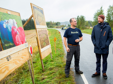 Etter det stoppet vi på et jorde, og der var Gunnbjørn, som er bonden som driver med land-art og blant annet har laget kommunevåpenet. Det er flere her som lager land-art i kommunen - jeg vet det - ordføreren har jo farget sauene sine ... Gunnbjørn har også laget Skrik på jordet sitt. Vi så noen bilder av det - utrolig kult.