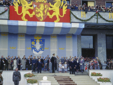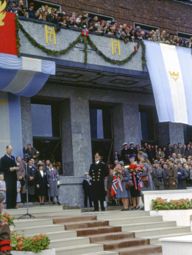 Årene var lange. Det nekter jeg ikke, Og mange ganger kan det for mange av dere ha sett svært mørkt ut. Men som det er blitt sagt, så tvilte jeg aldri på at Norge skulle få sin rett. Norge var på den skjendigste måte blitt overfalt ganske uforskyldt, og derfor følte jeg meg sikker på at Vår Herre ville føre det frem til den dag som vi står overfor i dag. At vi kom tilbake nettopp på den dagen da det norske folk fikk sin frihet og selvstendighet igjen, det er for meg et varsel om det som kommer baketter, at det også skal lykkes oss å gjøre vårt arbeid og innsats til landets gagn. Men for å oppnå det, må vi fortsatt stå sammen om de store ting, samlet om den store oppgave à få dekket over de arr som krigen har skapt her i landet. Men for å kunne oppnå det, må jeg ha et folk som er enig i å ville være med på det store arbeid. La oss ikke nå i gledens rus glemme at vi har et meget stort og vanskelig arbeid foran oss ved å skulle gjennomføre det som vi ønsker å skape her i landet, nemlig et fritt og godt samfunn for alle gode nordmenn.